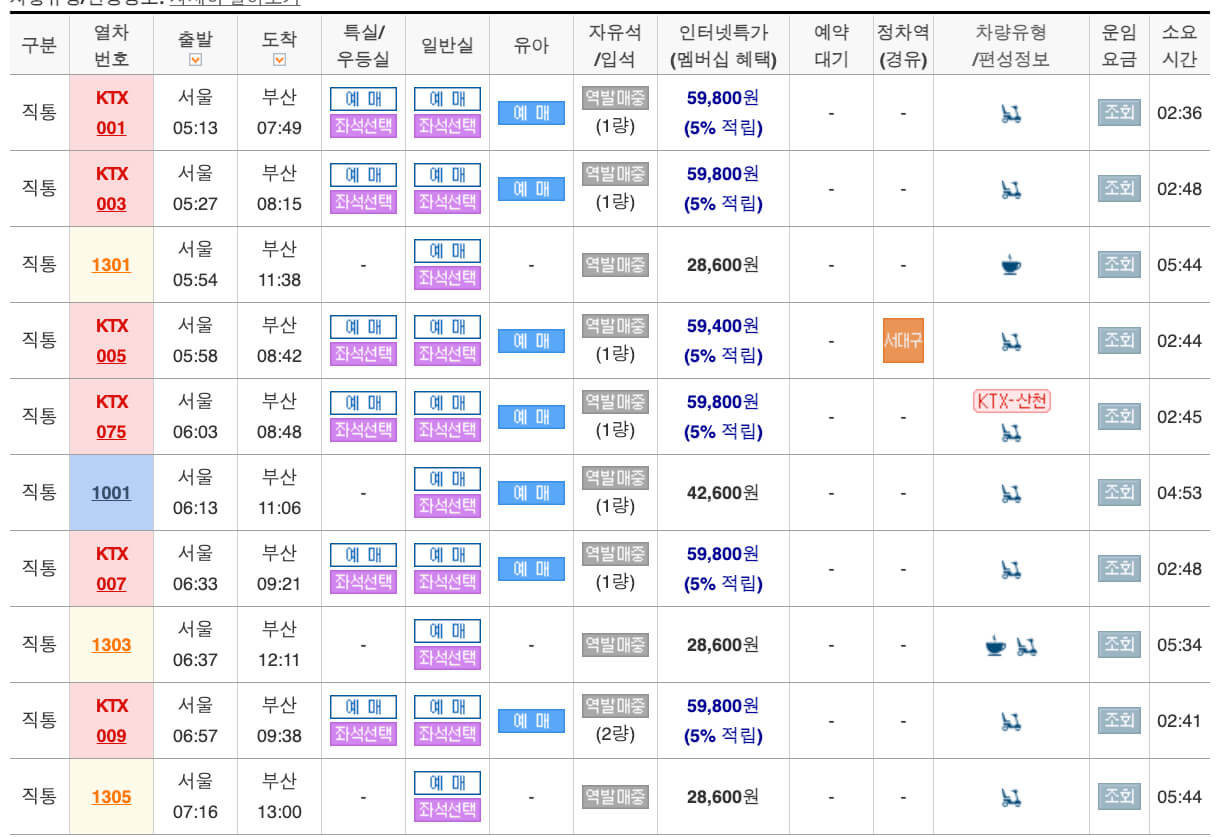 경부선 ktx 열차 예매는 위에 안내드린 경부선 ktx 열차시간표에서 원하는 시간대에 '예매'를 클릭한 후에 좌석을 선택하여 절차대로 예매 진행할 수 있습니다.