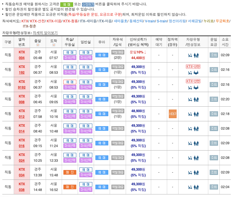 추천사항: 경주역 이용객은 매우 많은 편이기에 주말 성수기뿐만 아니라 평일에도 원하는 시간대에 열차표가 매진되는 경우가 많습니다.