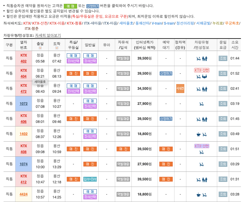 위에서 빨간색은 KTX, 노란색은 무궁화호 그리고, 파란색은 새마을호인 점 참고 바랍니다.