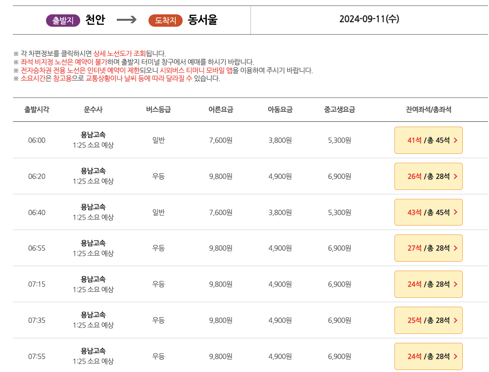 '조회'를 클릭하면 자세한 천안시외버스터미널 시간표를 아래와 같이 확인할 수 있습니다.